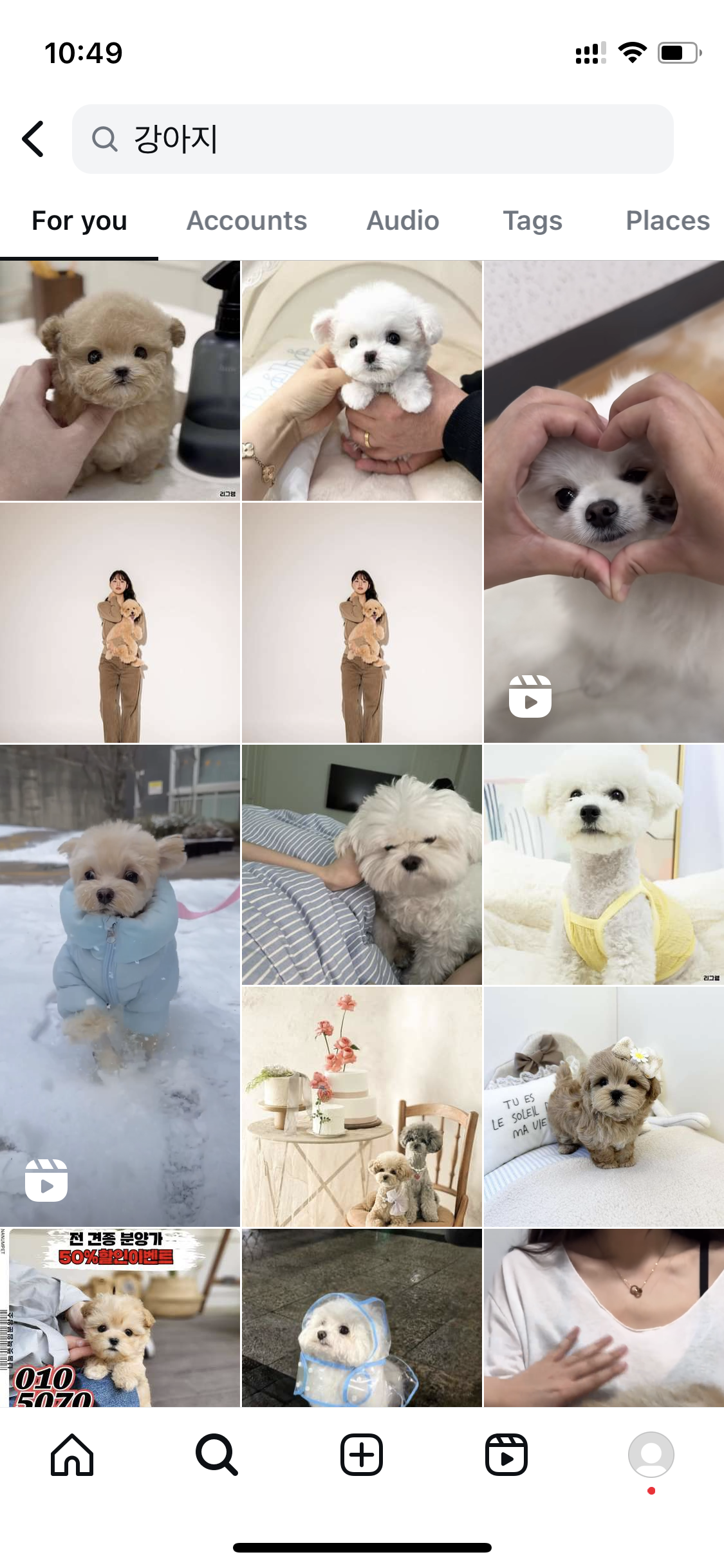 관심 계정을 찾아볼게요. 관심사가 강아지인 저는 강아지를 검색 해 보았습니다. 화면에 뜨는 여러 강아지 사진 중 마음에 드는 강아지가 있어 그 강아지를 쭉 보고싶어 팔로우를 할거예요.