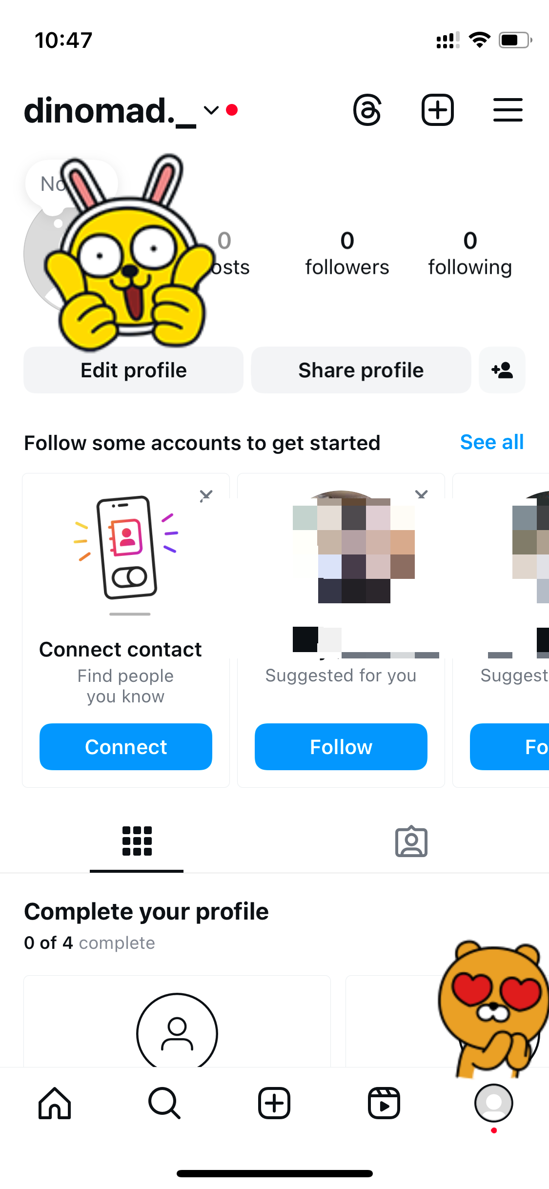 맨 하단 왼쪽의 집모양 버튼을 눌렀을때 첫번째 사진처럼 보이면 계정이 만들어 진 건데요, 이제 프로필 설정을 할 차례예요.